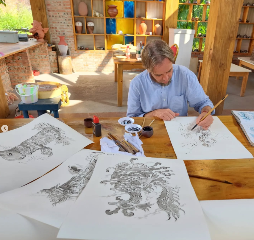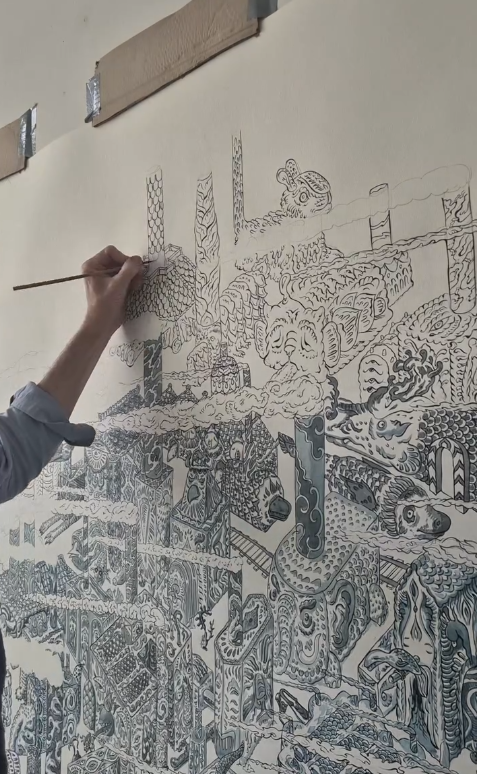 Zijn werken combineren verschillende invloeden. We zien kleurrijke, gedetailleerde schilderijen, tekeningen en keramische sculpturen van getekende muizen, uilen, Chinese draken, andere dieren en fantasiefiguren.